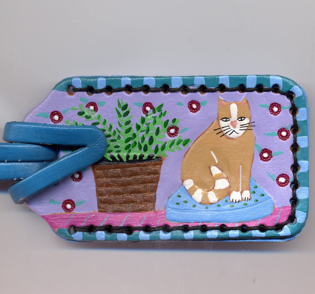 A light brown cat relaxes on his cushion next to a basket with fern. This colorful leather luggage tag is hand-tooled and painted with durable acrylic paint, finished off with a protective sheen.