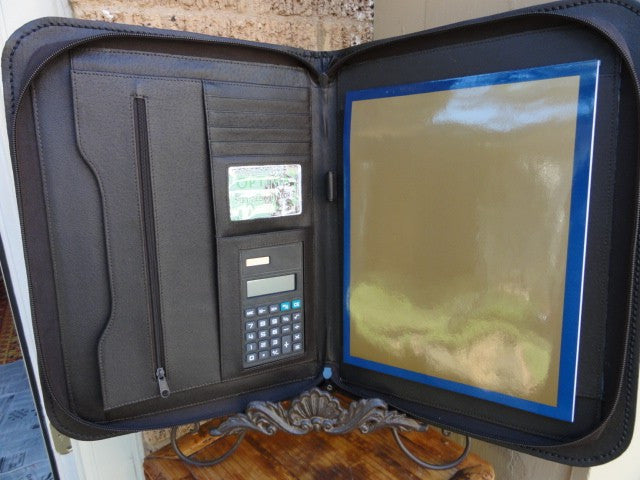 The portfolio is 14 1/4" by 10 1/2". It is all leather, with a zippered closure. The left side interior has one large space for papers, an inside zippered compartment, another space for smaller papers, five slots for ID or cards, and a calculator. The right side holds a tablet and pen. It is hand-sewn with black waxed thread.