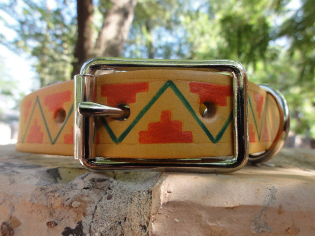The leather is a 1" strip that is dyed yellow and then the design is hand-painted on. It is finished with a coating of protective sheen. The collar is being modeled by our dog, Jack. He's 9 years old and we adopted him from the local shelter 8 years ago. He's a real sweetheart!