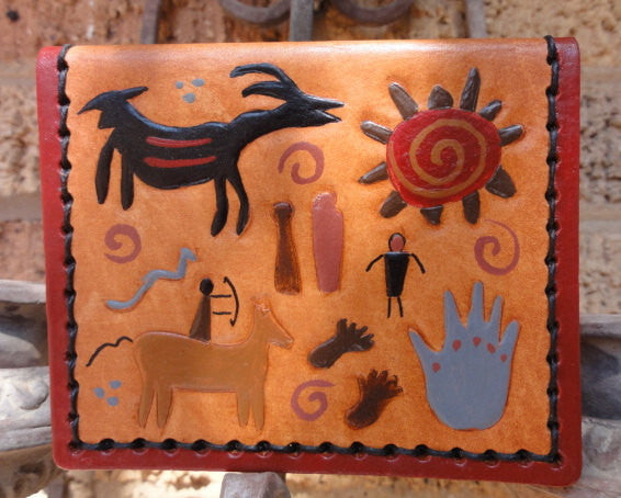 Petroglyphs are rock art that exist worldwide. Petroglyph designs have been adapted to leather on this ID case