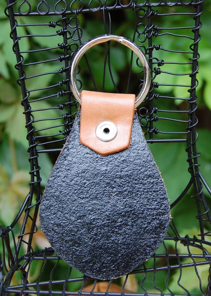The fob is leather, hand-tooled, stained, and painted with durable acrylic paint. It is sprayed with a protective sheen.