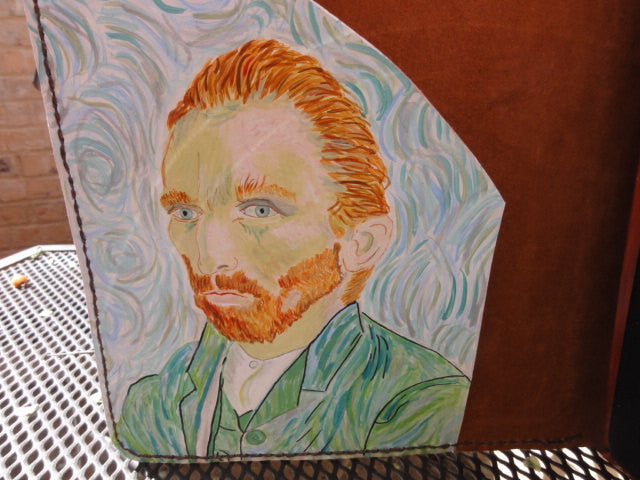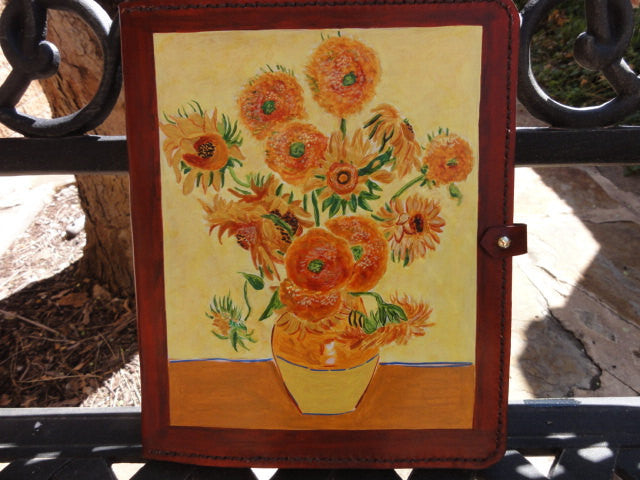 Van Gogh's "Sunflowers" is replicated on this all leather iPad case. The case measures 8 5/8" x 10 1/2". The leather is handcut, carved, tooled, painted, and sewn together with great care. The case is lined with reddish brown suede and an iPad II holder is sewn in place. The inside flap, for holding papers has Van Gogh's last self-portrait. There is an additional place for papers or document underneath the leather panel that the holder is attached to. The knob closure holds the case shut.
