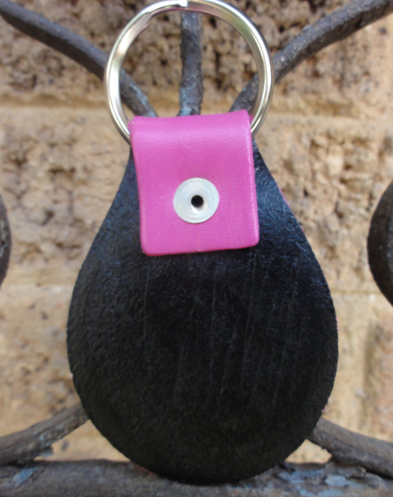 A colorful way to organize your keys! The leather fob is hand-tooled and painted with acrylic paint. The dimensions are 4" x 2" at it greatest width. It is finished with a protective sheen.