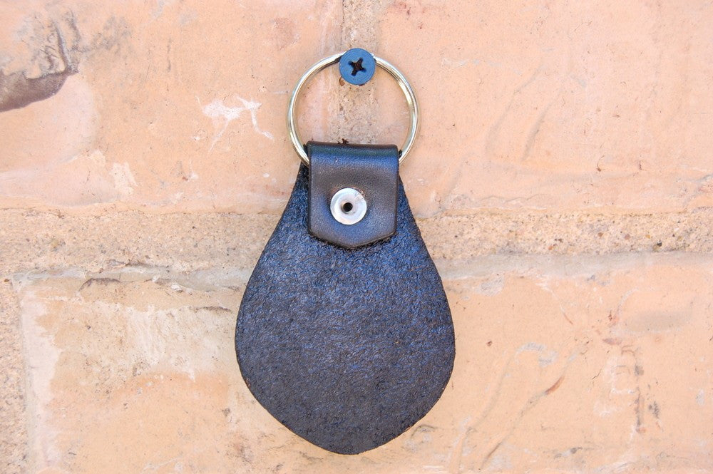 The fob is leather, hand-tooled, and painted with durable acrylic paint. It is sprayed with a protective sheen.