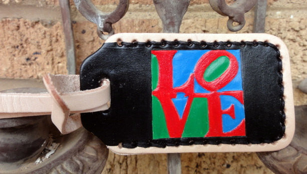The iconic LOVE symbol is hand-tooled and painted with acrylic paint, then sprayed with a protective sheen.