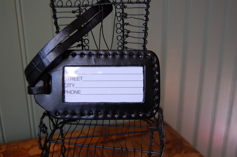 The leather luggage tag is hand-tooled and painted with durable acrylic paint, then finished with a protective sheen.