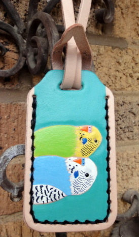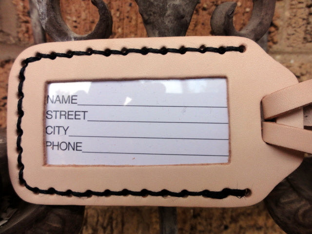 The leather luggage tag is hand-tooled and painted with durable acrylic paint, then finished with a protective sheen.