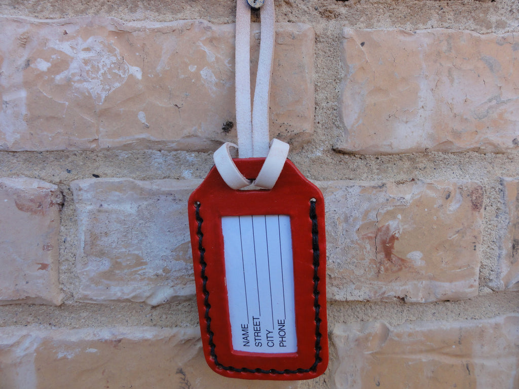 The leather luggage tag is hand-tooled and painted with durable acrylic paint, then finished with a protective sheen.