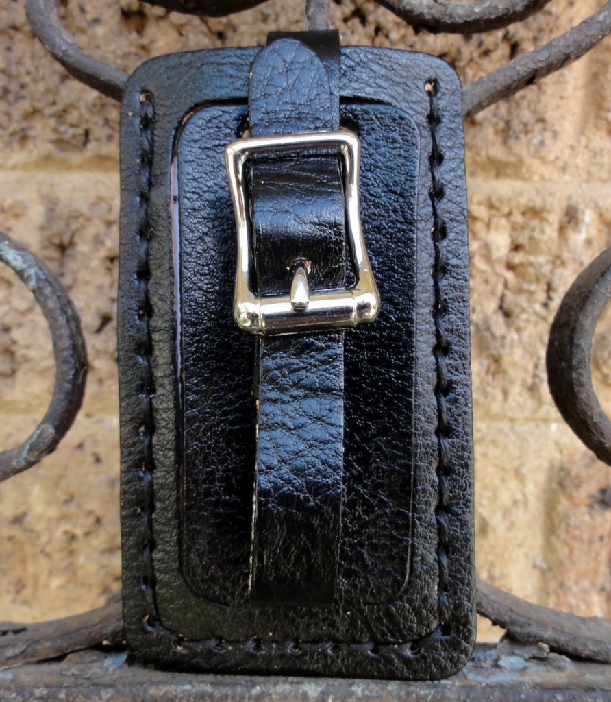 The tag is 4" x 2 1/4" with a strap and buckle that easily attach to your luggage.