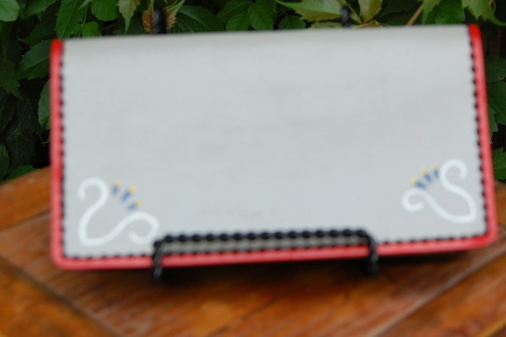 The checkbook cover measures 3 3/4" x 7" closed. The inside is all leather with a pocket to slide in the check book and two upper pockets for a check register or other papers or ID.