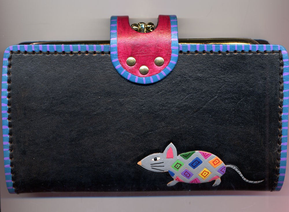 The leather wallet cover is a replica of a cloth mola made in Panama by Kuna Indian women. Instead of cloth, the design is drawn on leather, hand-tooled and hand-painted with durable acrylic paint, then sprayed with a protective sheen. It can be cleaned with a damp cloth. The reverse side is also decorated.