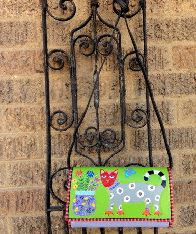 The leather purse has a brightly colored, fanciful cat, a pot of flowers and a butterfly on the cover. Inside is another cat with different colors. The design is drawn on leather, hand-tooled and hand-painted with durable acrylic paint, then sprayed with a protective sheen. It can be cleaned with a damp cloth.