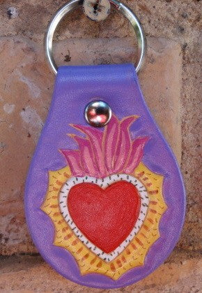 The sacred heart is a flaming heart with divine light. This one is hand-tooled and painted with acrylic paint on a leather key fob. The bright colors stand out! This will give you years of use and organize your keys in a distinctive way.