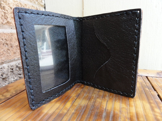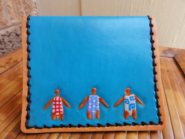 The case is hand-tooled and painted with acrylic paint and leather stain, then finished with a clear sheen. Finally it is hand-sewn with waxed thread. The ID case measures 4" x 3 1/4", closed. Inside it has a slot for credit cards or ID and a clear window for a driver's license or favorite picture. The back is also decorated with smaller sisters. Also available in turquoise or in any other color you might like!