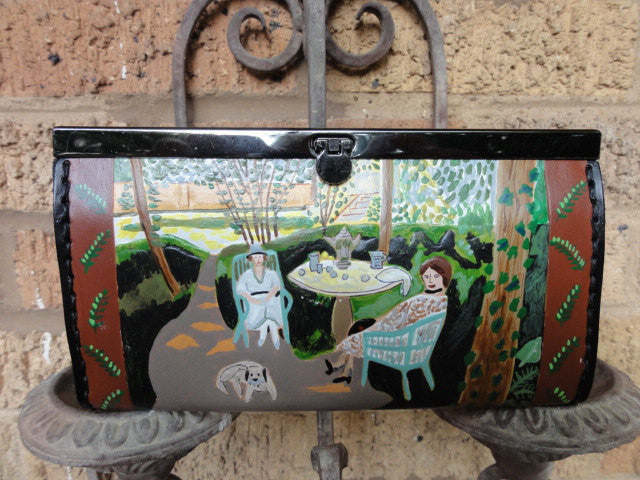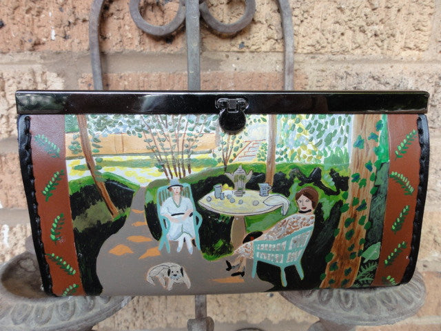 This wallet is hand-tooled and painted with a replica of Matisse's "Tea in the Garden" painted in 1919. This replica has rich, warm colors, painted with durable acrylic paint. What a beautiful scene to view every time you use your wallet!