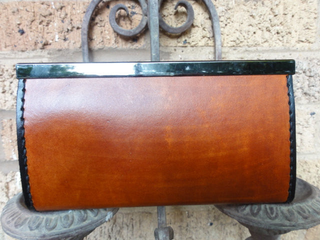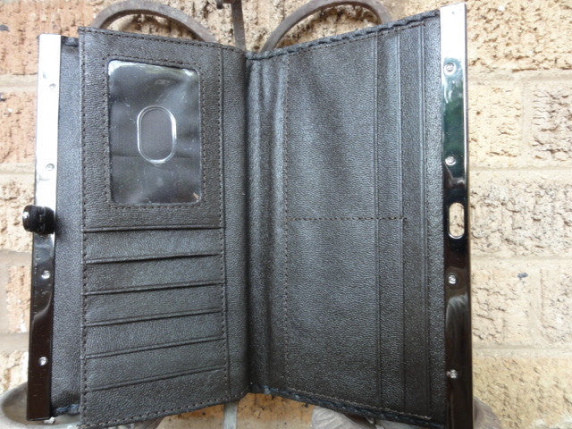 This clutch purse or wallet is 7 1/2" by 4 1/4". It closes with a metal latch that is easy to use. Inside it has 10 slots for credit cards or ID and 4 compartments for cash or papers, including one zippered compartment.