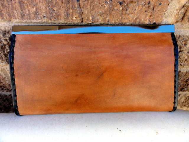This clutch purse or wallet is 7 1/2" by 4 1/4". It closes with a metal latch that is easy to use. Inside it has 10 slots for credit cards or ID and 4 compartments for cash or papers, including one zippered compartment.