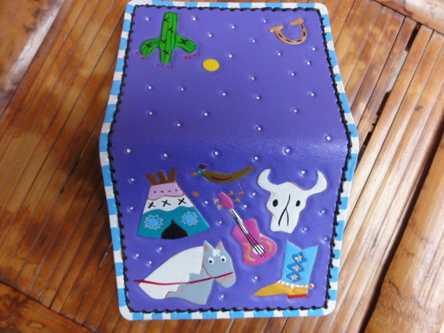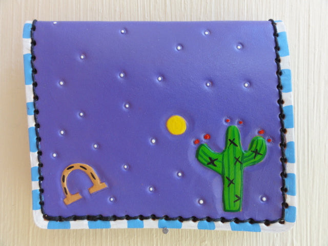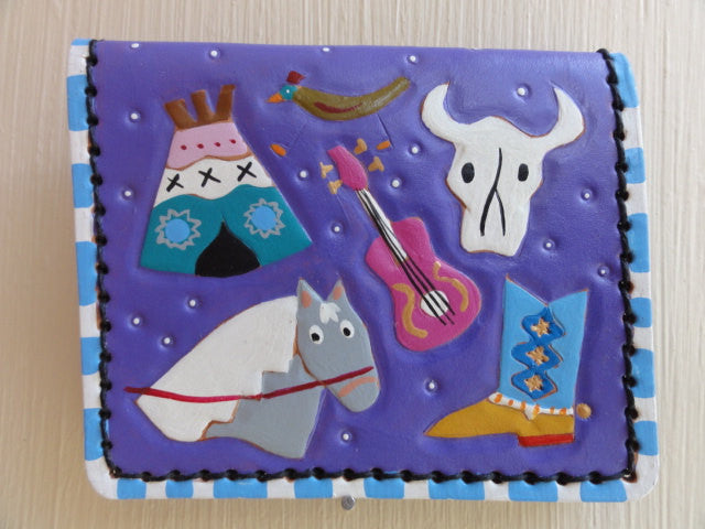 This western design was inspired by a charm bracelet I have with a cowboy theme. I thought about sprinking western icons across leather. This ID case has a violet background, but I have also made this design in red, black, tourquoise, or natural leather. Let me know if you want a different color.