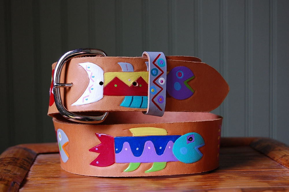 Wildly colorful fish are swimming on this aquatic, leather belt. Shown in natural background or in teal. Let me know which you prefer, or if there is a different background color you want.