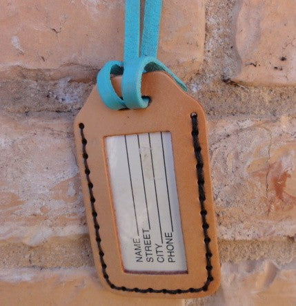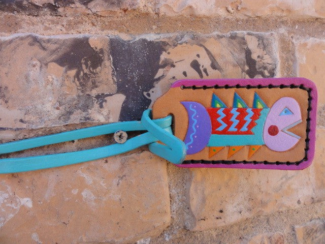 Inspired by weaving from Central America, this colorful, leather luggage tag is hand-tooled and painted with durable acrylic paint, then finished with a protective sheen.